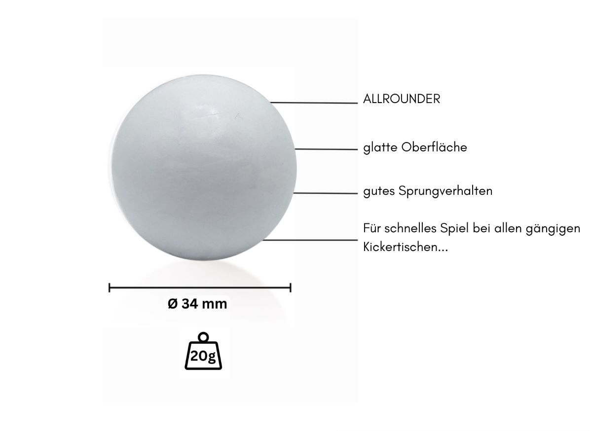 Der ALLROUND-Kickerball hat einen Durchmesser von Ø 34 mm und wiegt ca. 20 g – das ideale Verhältnis für schnelle Ballwechsel, kontrollierte Pässe und gezielte Schüsse.